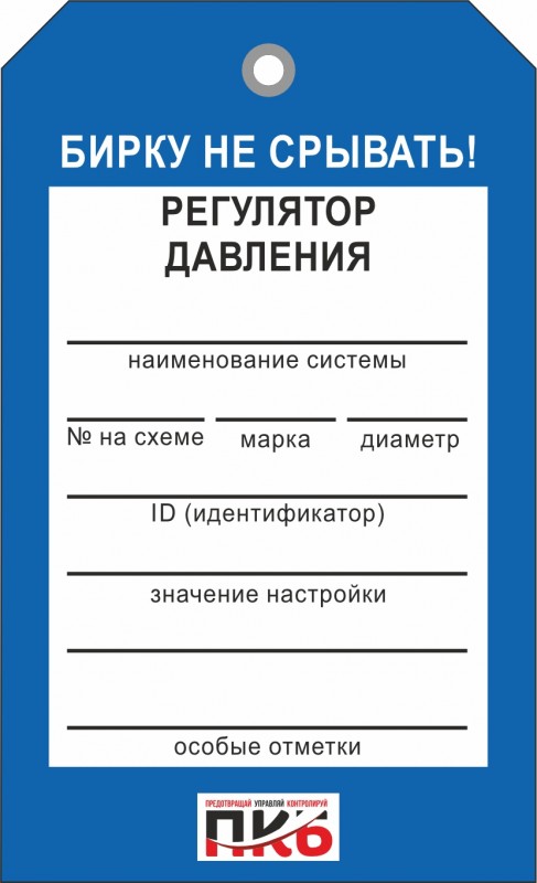 Информационная бирка "Регулятор давления". Изготовлена из пластика ПВХ, толщиной 0,3 мм, без ламинации, диаметр отверстия 7 мм. По желанию заказчика толщина бирки может быть увеличена до 1-2 мм. Нанесение текста необходимо производить маркером или шариковой ручкой. Размер 70 х 115 х 0,3 мм.
