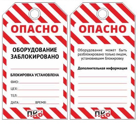 Информационная бирка для системы LOCKOUT TAGOUT "Оборудование заблокировано" PKB401, многоразового использования, двухсторонняя. Изготовлена из пластика ПВХ, толщиной 0,3 мм с ламинирующим покрытием, оснащена металлическим люверсом. По желании заказчика толщина бирки может быть увеличена до 1-2 мм. Нанесение текста необходимо производить перманентным маркером, при необходимости стирать и сделать новую надпись. Использовать либо технический спирт, либо растворитель Р-647. Размер 76 х 138 х 0,3мм. По желанию заказчика возможна кастомизация бирки с нанесением логотипа и/или названия предприятия на русском/английском языках.