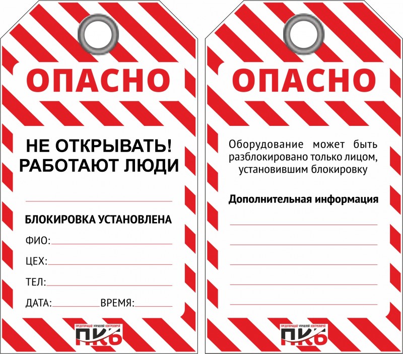 Предупреждающая бирка для системы LOTO "Не открывать, работают люди" PKB406, многоразового использования, двухсторонняя. Изготовлена из пластика ПВХ, толщиной 0,3 мм с ламинирующим покрытием, оснащена металлическим люверсом . По желании заказчика толщина бирки может быть увеличена до 1-2 мм. Нанесение текста необходимо производить перманентным маркером, при необходимости стирать и сделать новую надпись. Использовать либо технический спирт, либо растворитель Р-647. Размер 76 х 138 х 0,3мм.